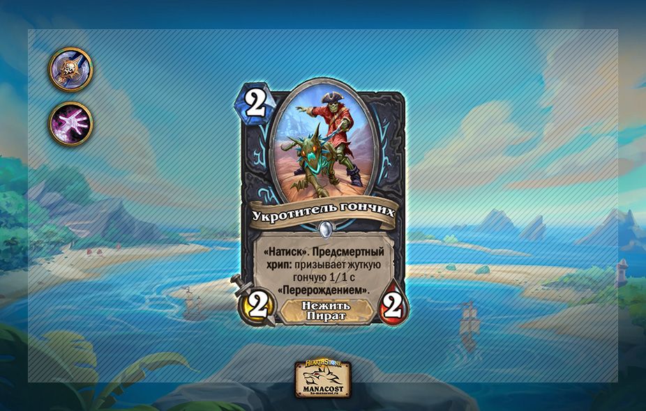 Укротителя гончих очень приятно скомбинировать с Костлявым буканьером, в то время как сам буканьер может попасть в колоды класса благодаря сверхмощной синергии с Бригадиром Реской. Такой набор карт можно использовать даже в классическом Радужном ДК.
