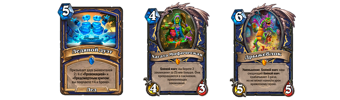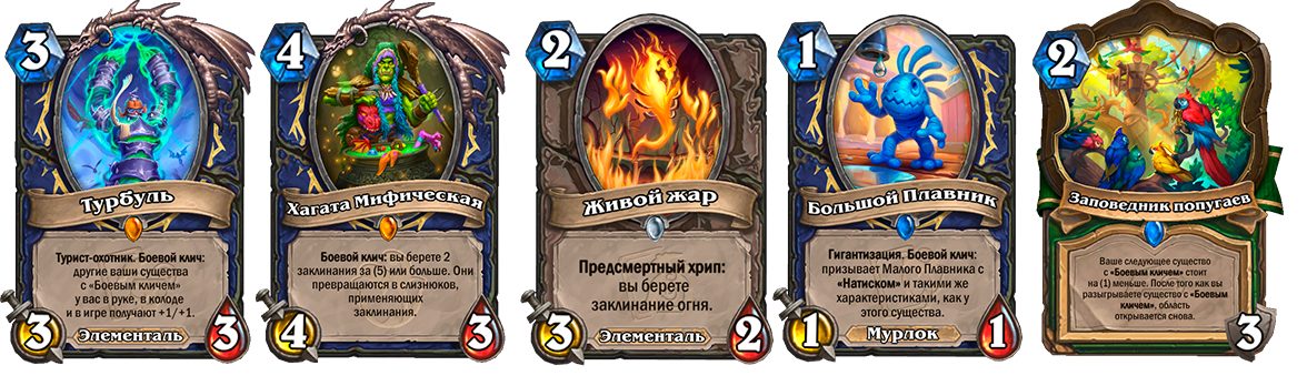 Ледяной дуэт — ваша лучшая защитная опция в середине игры. Один из сильнейших ходов на 5-й мане — разыграть это заклинание через Слизь: так вы не только получите две провокации, но и перехватите инициативу. За ранний темп отвечают Первозданная смотрительница, Турбуль и Неуклюжий коридорный: все они обладают боевыми кличами, благодаря чему Турбуль становится особенно эффективным уже в начале партии.