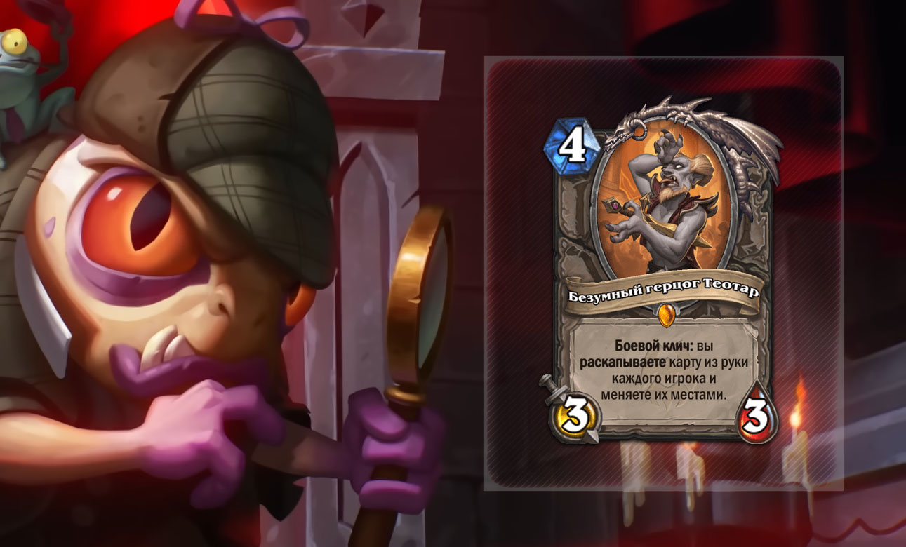 Противник намерен убить вас какой-то ОТК комбинацией? Вся его колода вращается вокруг одной единственной карты? Оппонент только что сделал квестлайн и еще не сыграл финальную награду? Или Биг Спелл Маг с помощью Чародейки-варвара удешевил свое мощное заклинание и еще не сыграл его? Или вы хотите отнять у Друида его Леди Престор? Или просто забрать Потасовку или Круговерть Пустоты, пока они не зачистили стол? Или Чернокнижник дал вам наносящее большой урон Глубинное проклятие? Со всем этим поможет Безумный герцог Теотар.