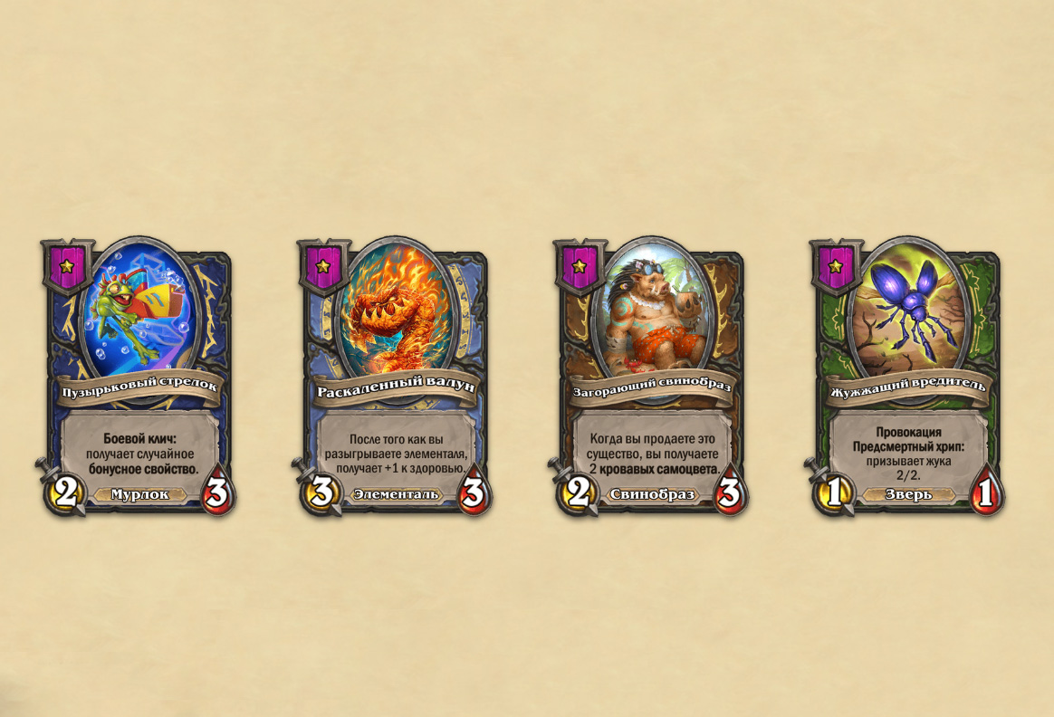 Здесь собрались существа, у которых есть свои плюсы, но есть и явные недостатки. Пузырьковый стрелок может быть сильным, но зависит от выпавшего эффекта на старте. Позднее может стать ключевой угрозой, но со слабым бонусом на 1-м ходу и без выхода в мурлоков будет ужасен. Загорающий свинобраз — плохое существо, но дает +2/+2 в ход с 5 монетами, а Раскаленный валун и Жужжащий вредитель — середнячки, с небольшим потенциалом в мидгейме.