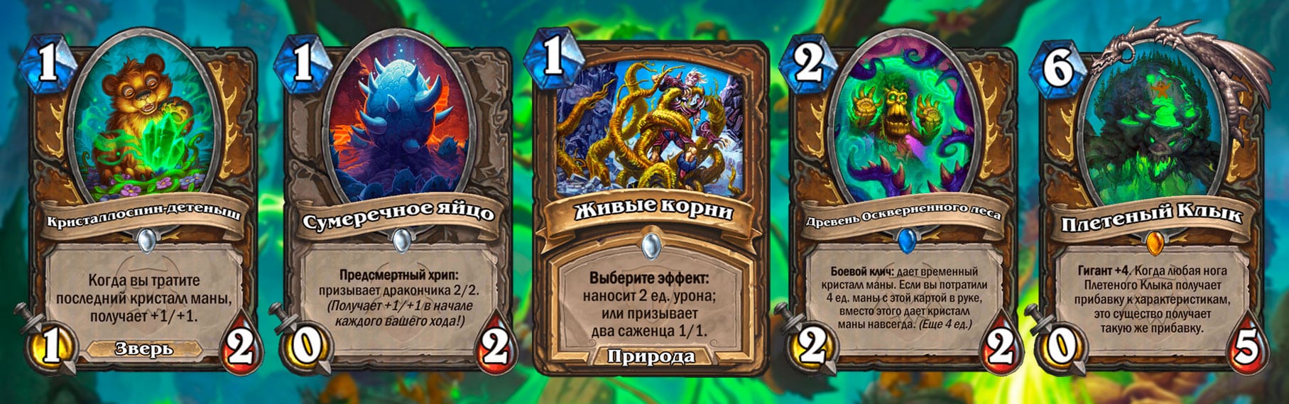 Древень оскверненного леса — многие игроки уже просят ослабить эту карту за ее мощный эффект. Вы выставляете существо и сразу получаете целый кристалл маны. Если вы потратили 4 маны, удерживая эту карту в руке, кристалл остается навсегда. Рекомендуем разыгрывать карту только после ее улучшения.