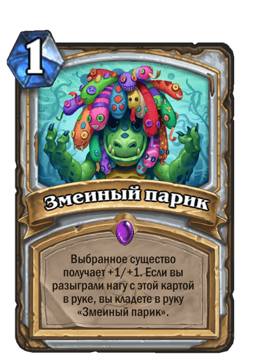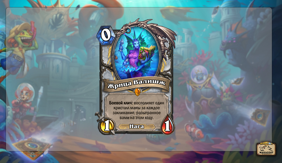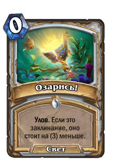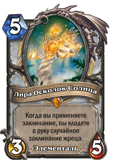 Отличная карта для колоды Жреца с большим количеством дешевых заклинаний и способами сгенерировать их. Только в Путешествии в Затонувший город класс получил несколько хороших и недорогих заклинаний — Озарись!, Змеиный парик, Шепот бездны. Но куда важнее то, что в новом Основном наборе возвращаются Сияющий элементаль и Лира Осколок Солнца — топовые синергии со Жрицей Валишж.
