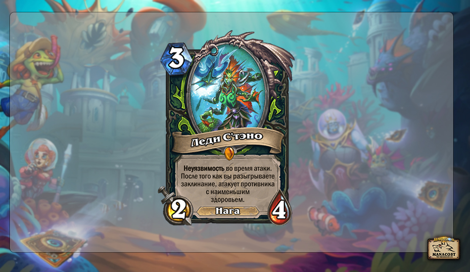 Только представьте, что может сделать эта легендарка с нужной рукой: зачистить весь стол и даже убить героя противника, если стол пуст. Главное найти достаточно дешевых заклинаний, что не должно быть серьезной проблемой для Охотника на демонов. Интересно, что Леди С’тэно можно баффнуть дополнительную атаку, чтобы она наносила больше урона с каждым кастом. И пусть ДХ не так славится баффами характеристик своим существам, какие-то способы сделать это есть и среди нейтральных карт.