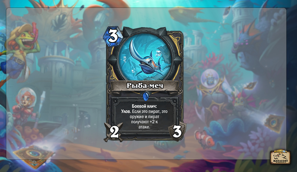 Не все ждут эту карту, но нельзя ее не отметить — уж слишком сильный у нее эффект. 4/3 оружие за 3 маны — это очень много, добавьте сюда многочисленные баффы оружия, которые есть у Разбойника, и вы получите хорошие предпосылки для возвращения Пират Агро Разбойника. Важно, чтобы в Стандарте было достаточное количество сильных пиратов, потому что иначе Рыба-меч работать не будет.