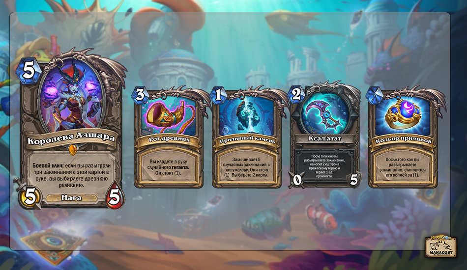 Важны Реликвии Азшары, ради которых карту и будут использовать. Две из них синергируют с заклинаниями. Кольцо приливов подойдет колодам с тяжелыми и сильными спеллами вроде Огненной глыбы, а Ксал’атат — колодам с недорогими спеллами вроде Миракл Жреца.