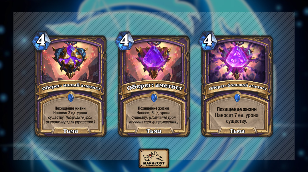 Оберег: малый аметист может встать в один ряд с такими картами, как Арфа Скверны и Виртуоз Бездны, чтобы помочь Чернокнижнику защитить себя. Это не только неплохой ремувал, но и источник исцеления, которое ценится Чернокнижником намного больше, чем другими классами.