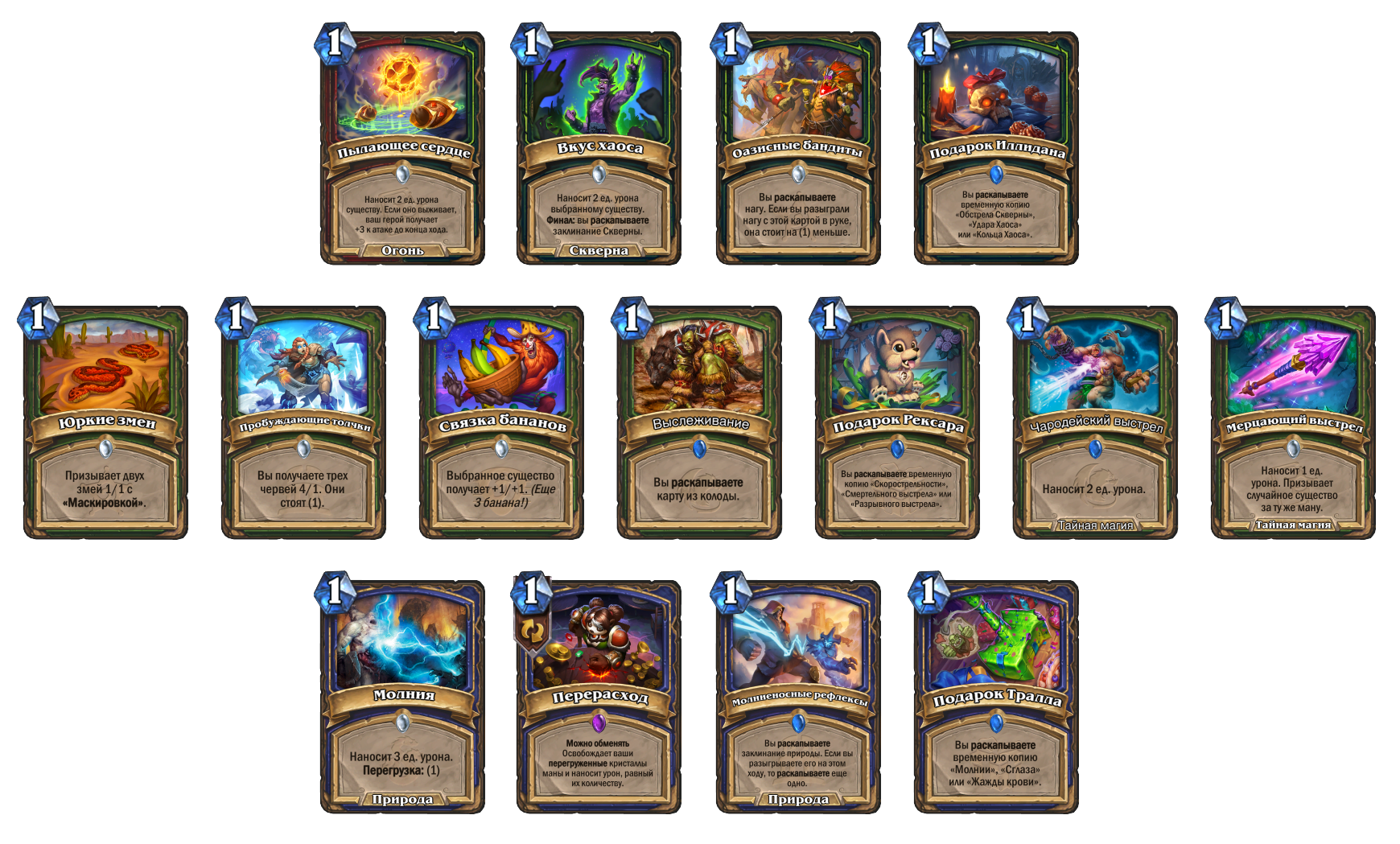 Многие хоронят медленные колоды Друида, в котором может заиграть Зов чащобы, но выводы преждевременны. Да, из Стандарта уходит Дар природы, но замену поможет закрыть Кристаллическая друза. Буйный рост и вовсе не уходит — теперь он будет не в Основном наборе, а в Подарке Малфуриона и за 2 маны. Кроме того, остаются Брызгающийся дракончик и Роковой совух.