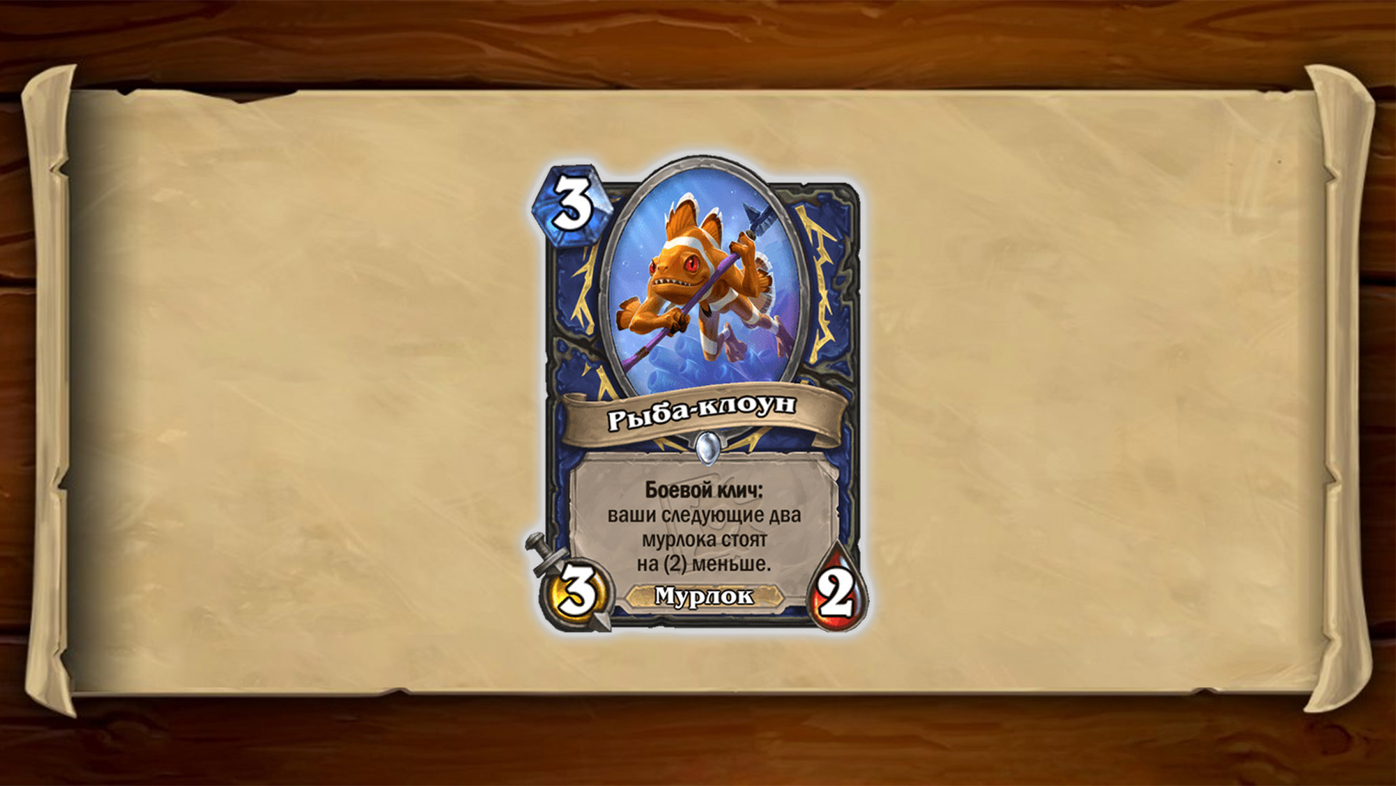 Рыба-клоун дает очень много темпа, притом важно, что ее можно сыграть в темп в любой момент игры: удешевление переносится и на следующие ходы. Великолепно выглядят комбинации с Болнером Ударом Клюва, хотя Рыбу-клоуна могут использовать и обычные темповые Мурлок Шаманы. Возможно, мы часто будем встречать в ладдере комбинации с Пиромантом Флурглом.