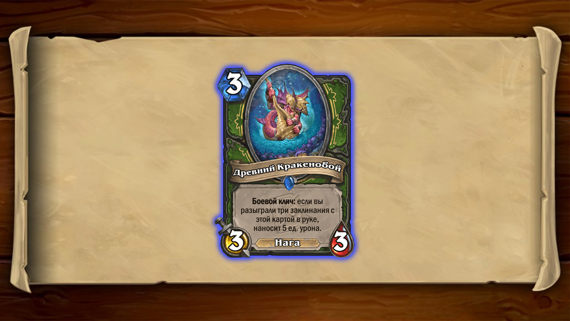Кажется, разработчики хотят вернуть Фейс Ханта в мету. По крайней мере Древний Кракенобой явно на это намекает. Это нага, что уже хорошо — в колоде много синергий с этой расой. Боевой клич на 5 урона по существу или герою противника — великолепный эффект для архетипа. Сыграть 3 заклинания достаточно просто, учитывая Монетку и дешевые заклинания Фейс Ханта (Подранок, Чародейский выстрел, Собачье лакомство, Шипастые сети и т.д.).