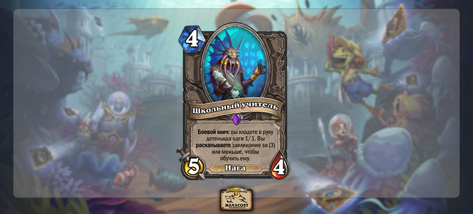 Школьный учитель генерирует очень сильную нагу за 1 маны, которая кастует раскопанное вами заклинание. Такая нага отлично работает с Бранном Бронзобородом, Болнером Ударом Клюва, Сиреной Бича Злобы, да и сама по себе дает очень много темпа.