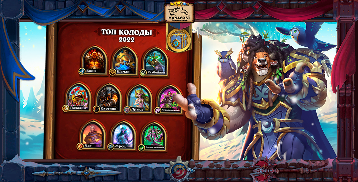 Не знаете, чем поиграть в начале январского сезона? Смотрите подборку лучших колод старта 2022 года для всех классов. С каждой из представленных ниже дек можно взять Легенду. Больше актуальных колод Стандарта в 2022 году ищите в специальном разделе сайта, который мы обновляем каждый день: Единственная конкурентоспособная колода класса — Квест Пират Воин. Зато какая это колода: на многих рангах это лидер и по популярности, и по винрейту. Лучше всех Воин справляется с Магами, но значительно уступает по силе Манускрипт Паладину, Хэндлоку и опытным Разбойникам. У Мага много интересных колод, но ни одна из них не показывает высокий винрейт по статистике. Класс хорош только в руках тех, кто умеет с ним обращаться. Основная же масса игроков вынуждена играть Магом посредственно: средний винрейт будет близок к 50% или даже чуть ниже. Манускрипт Паладин — одна из лучших колод меты, у которой нет плохих матч-апов среди самых популярных представителей ладдера. Взяв эту колоду, вы легко возьмете Легенду и даже ее высокие ранги. Как и Маг, Разбойник силен только в руках самых опытных игроков. В топ-1000 Легенды сразу у нескольких архетипов Валиры самый высокий винрейт в игре. Если вы уверены в своих силах, класс хорошо послужит вам в начале года. Не сказать, что Шаман доминирует в мете Альтерака, но все же класс в достойном положении. Чаще играют ОТК Шаманом, а другие архетипы встречаются редко. У класса хорошее и равномерное распределение матч-апов: победить можно любого, но и любому можно проиграть. Уже целый год Фейс Хант сохраняет позиции самого сильного и популярного архетипа класса. Пусть среди лидеров не так много простых матч-апов, в целом Фейс Хант чувствует себя комфортно и не сдает позиции. У Друида нет какой-то одной доминирующей колоды: сразу несколько архетипов борются за лидерство хотя бы внутри класса. У Жреца тоже много разных колод. Почти все они отлично справляются с Паладинами и Фейс Хантами, поэтому и держатся на плаву. Но другие матч-апы не обнадеживают, так что пока что положение класса скромное. Чернокнижник — недооцененный класс. Классический Квест Хэндлок отлично чувствует себя в мете, потому что справляется и с Воинами, и с Разбойниками, и с Шаманами. Даже с Мордреш Магами и Манускрипт Паладинами матч-апы достойные, а проблемой станут только Фейс Хант и Мозаки Маг. Самый непопулярный класс, но едва ли самый слабый. Охотник на демонов Скверны — хорошая колода в умелых руках. Какими колодами вы играете в начале 2022 года? Делитесь вашими впечатлениями от меты в комментариях. Удачи! Наша группа Вконтакте, присоединяйтесь: