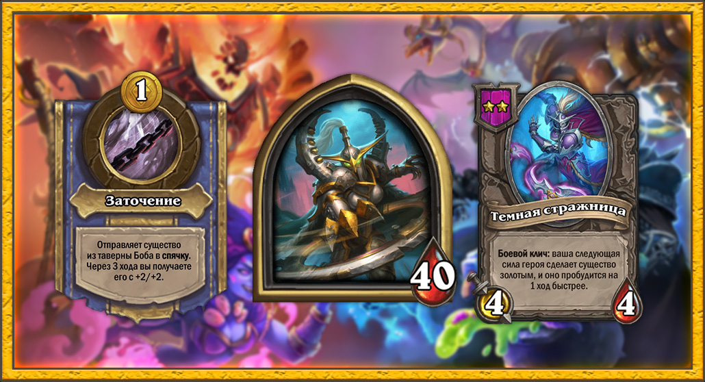Важно, что это тир-2 компаньон, так что Майев получит его первую копию достаточно быстро. Золотое существо из таверны можно будет разыграть сразу же после взятия 4-5 уровней таверны, что поможет раскопать мощную угрозу высокого уровня. Чем-то эффект Темной стражницы напоминает силу героя Капитана Юдоры, но Майев не нужно тратить 5 золотых, а золотое существо она выбирает сама, а не получает случайное.
