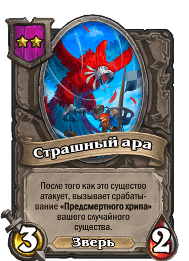 Часто Страшный ара становится ключевой угрозой на столах разных рас, несмотря на то, что это тир-2 существо. Он особенно хорошо работает с разнообразными баффами, но не так хорошо со способами призыва, потому что на столе часто не хватит места.