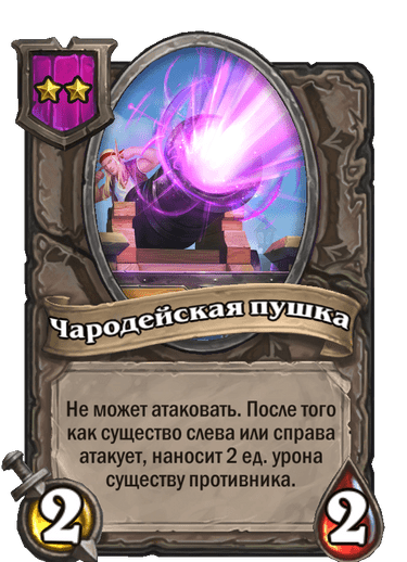 Чародейская пушка сильна преимущественно со старта партии. Ее обязательно нужно покупать на 5-8 монетах, а после желательно найти несколько хороших синергий с этим тир-2 существом. С Чародейской пушкой хорошо работают Шалопайка, Йо-хо-хогр и многие «липкие» существа, которые умирают при первой атаке, например, Мехуру или Крысиная стая.