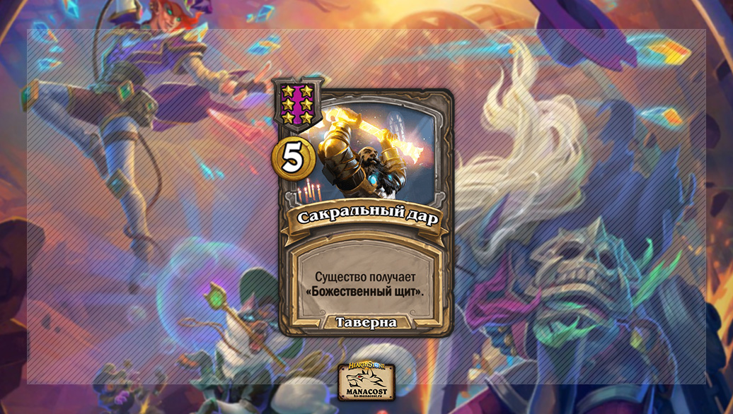 Это Заклинание таверны для самого конца игры, когда вы уже попали в топ-4 лобби и сражаетесь за первую строчку. Стоимость спелла высокая, часто в ход с его покупкой вы уже ничего особо не сделаете. И это не так страшно только в конце игры, когда композиция собрана, статы получены и особого развития стол не получает, потому что в пуле не осталось достаточного количества нужных существ. Тогда бафф божественного щита полезен, причем можно найти много Сакральных даров. Спелл подойдет для любой композиции в игре, хотя в каких-то случаях он будет сильнее, например если у вас есть существо с массовой атакой или просто огромными статами.