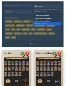 - Сортировка по тегам и игрокам (например, агро, контроль или Дикий Зверь)