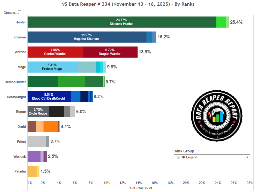 Охотник на раскопке был абсолютно не у дел перед патчем, но воспользовался отсутствием сильных конкурентов, которое образовалось после массовых нерфов, и забрался на вершину меты. Колода постепенно захватывает топ Легенды, и крайне вероятно, что ее численность превысит 30% в ближайшее время. Единственные новые карты в колоде — это сестры Ветрокрылые, и они внесли в нее большой вклад. Фейс Охотник встречается редко и не привлекает внимание игроков с момента релиза Потоков времени.