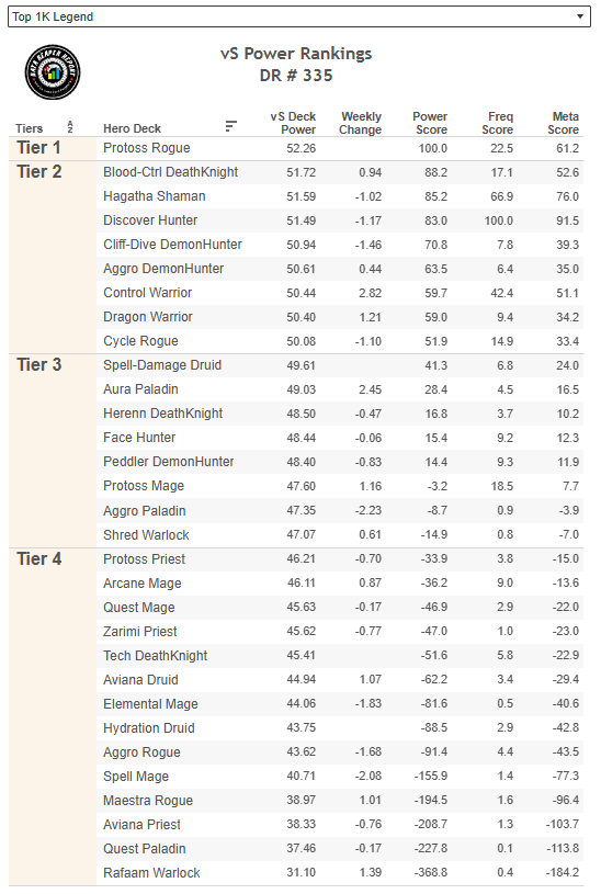 Доносящиеся отголоски Протосс Разбойника на прошлой неделе превратились в разрушителя меты высоких рангов на этой. Почему же он так силен в топе Легенды? Потому что побеждает Охотника на раскопке и Квест Воина, то есть опережает мету на один шаг. Важный прорыв в сборках колоды позволяет ей не проигрывать Шаману. У Протосс Разбойника есть тяжелые матч-апы, и рост его популярности может привести к цикличной мету на высоком рейтинге. На более низких рангах колода тоже неплоха, но не так сильна из-за комбинации причин: менее четкое исполнение стратегии игроками, более сложный разброс матч-апов, менее оптимизированные сборки.