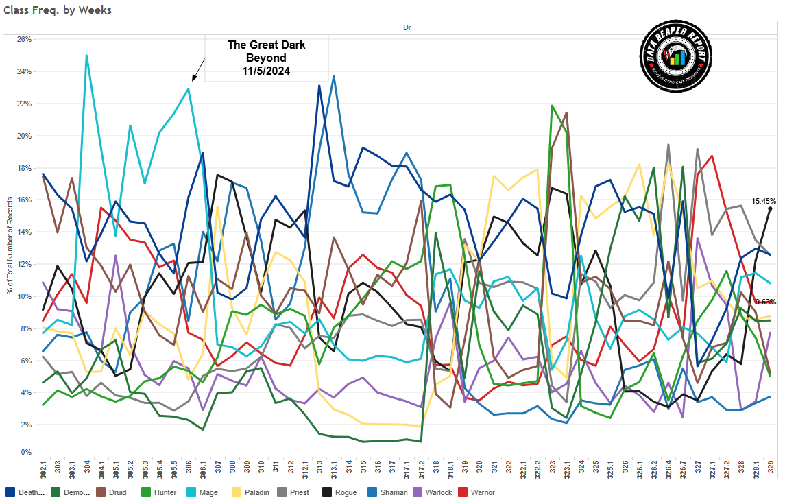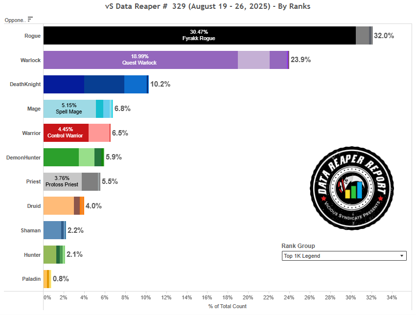Квест Чернокнижник стал расти на фоне спада СПД Друида — одного из его самых сложных противников перед патчем. Сейчас Квест Лок — вторая по популярности колода на вершине Легенды с 20% плейрейта, уступающая лишь Фиракк Разбойнику. Самая популярная сборка наконец-то определилась и расходится по остальным рангам. Звездолет Чернокнижник тоже приподнялся в топе Легенды, но лишь слегка.
