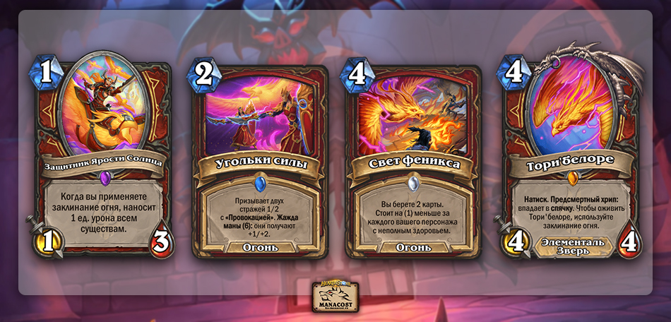 В колоде есть синергии заклинаний Огня — Защитник Ярости Солнца, Угольки силы, Свет феникса, Импровизация и Торибелоре. Вам не всегда зайдут все эти карты одновременно, а в деке их не так уж и много. Поэтому не ждите, что сможете постоянно воскрешать Торибелоре или много раз наносить урон всему столу с помощью Защитника Ярости Солнца. Но даже одного заклинания Огня достаточно, чтобы Воин получил достаточно выгоды и темпа.
