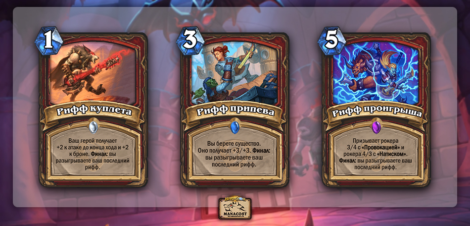 Из-за недавних баффов карт в деку попадает набор риффов — Рифф куплета, Рифф припева и Рифф проигрыша. Это самостоятельные карты, которые работают только друг с другом. Они хороши сами по себе, обеспечивая Воина контролем стола, характеристиками и картами. Риффы повторяют друг друга, самое сложно сыграть только первую копию, потому что от нее темпа будет мало. Зато после каждый рифф станет отличной картой.