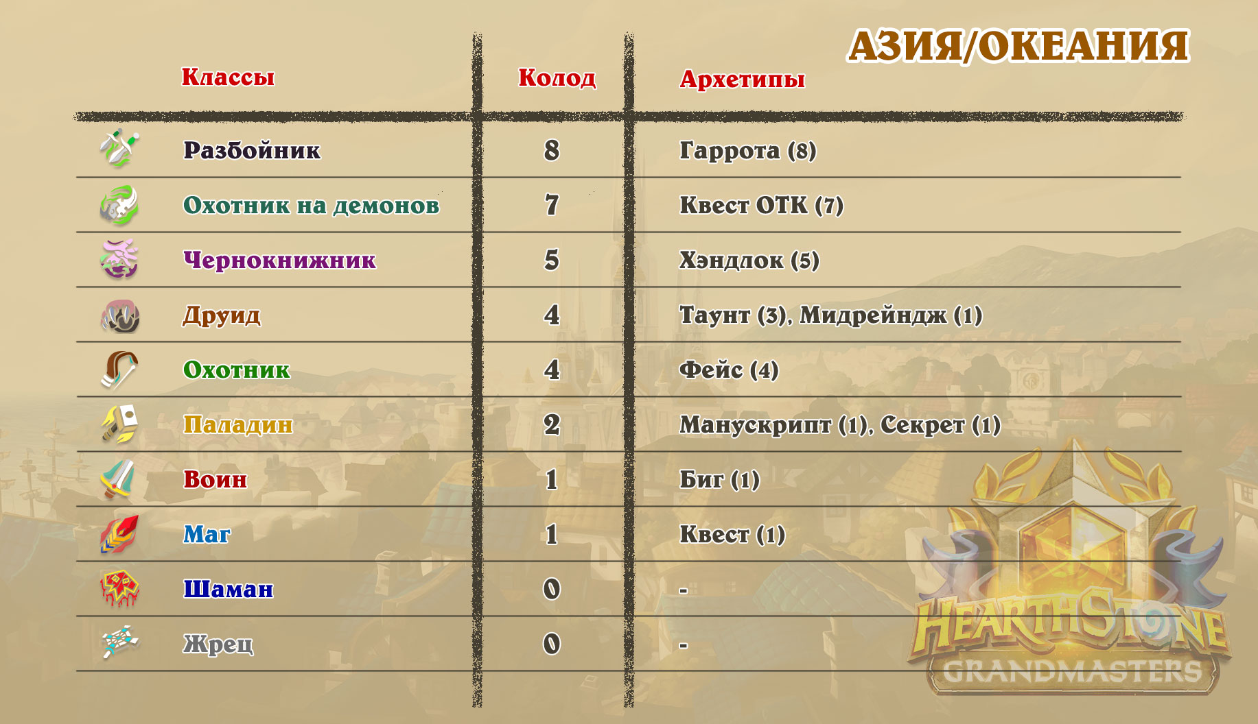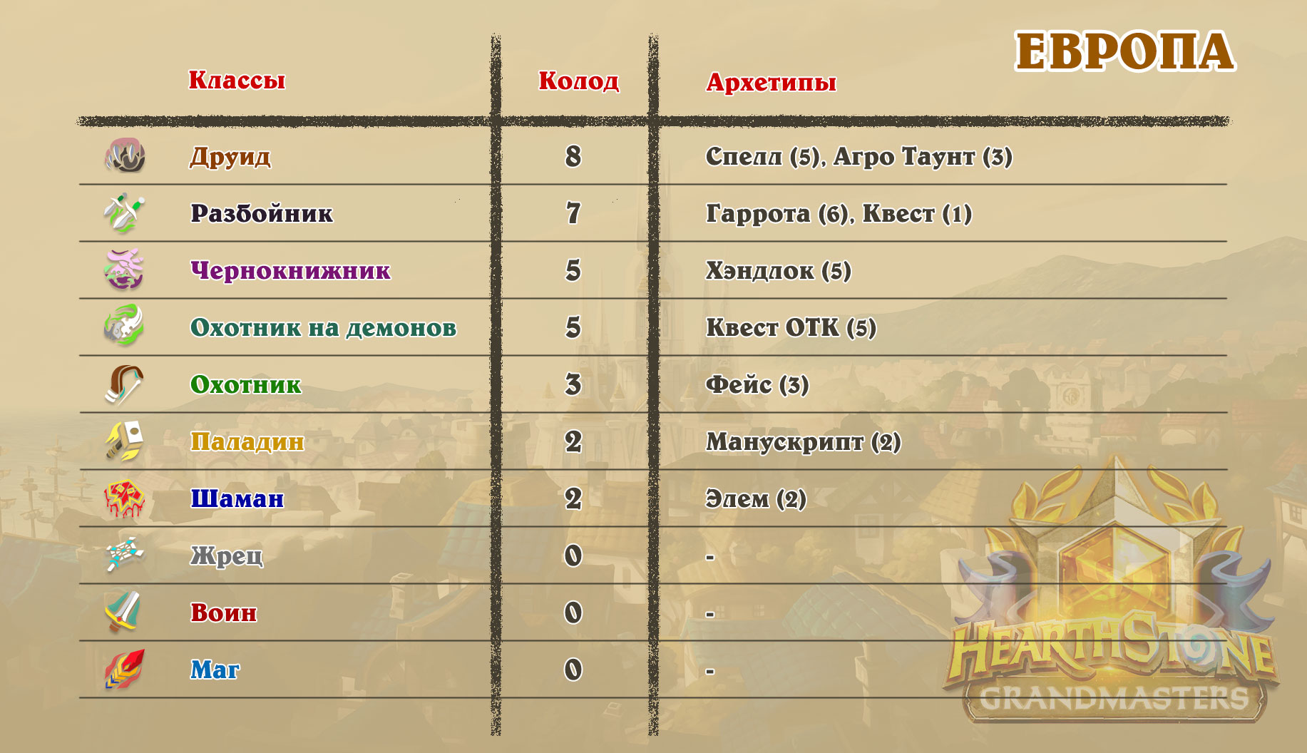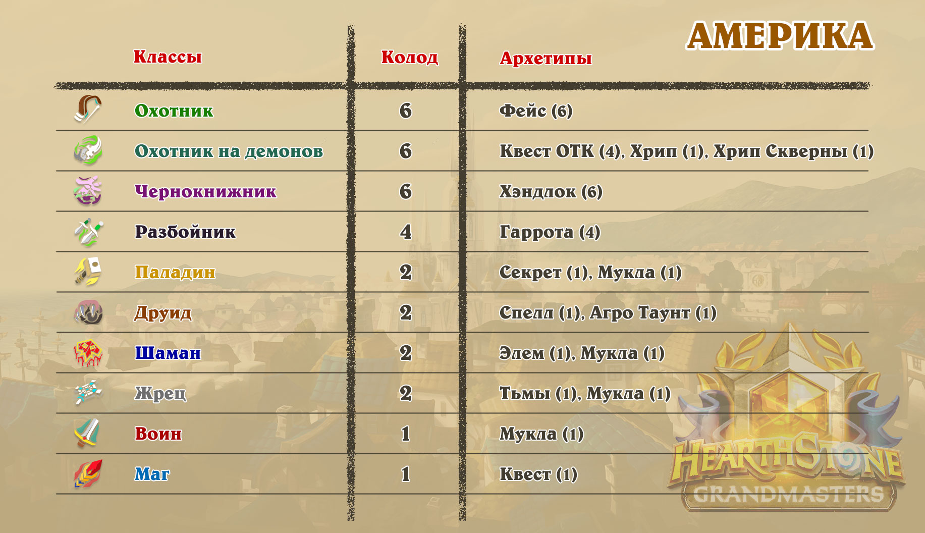 Самые стабильные колоды турнирного формата выделить несложно — это ОТК Квест Охотник на демонов, Гаррота Разбойник, Квест Хэндлок и Фейс Охотник. Однако подобный лайн-ап заявили только 6 человек.